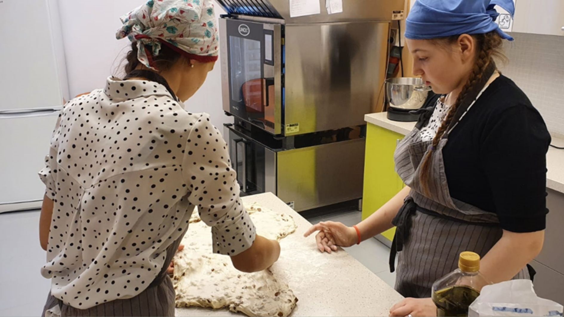 Поместите тесто в сбрызнутую оливковым маслом емкость, накройте пленкой и оставьте для брожения на полтора часа. Каждые полчаса производите обминку, т.е. за это время дважды.