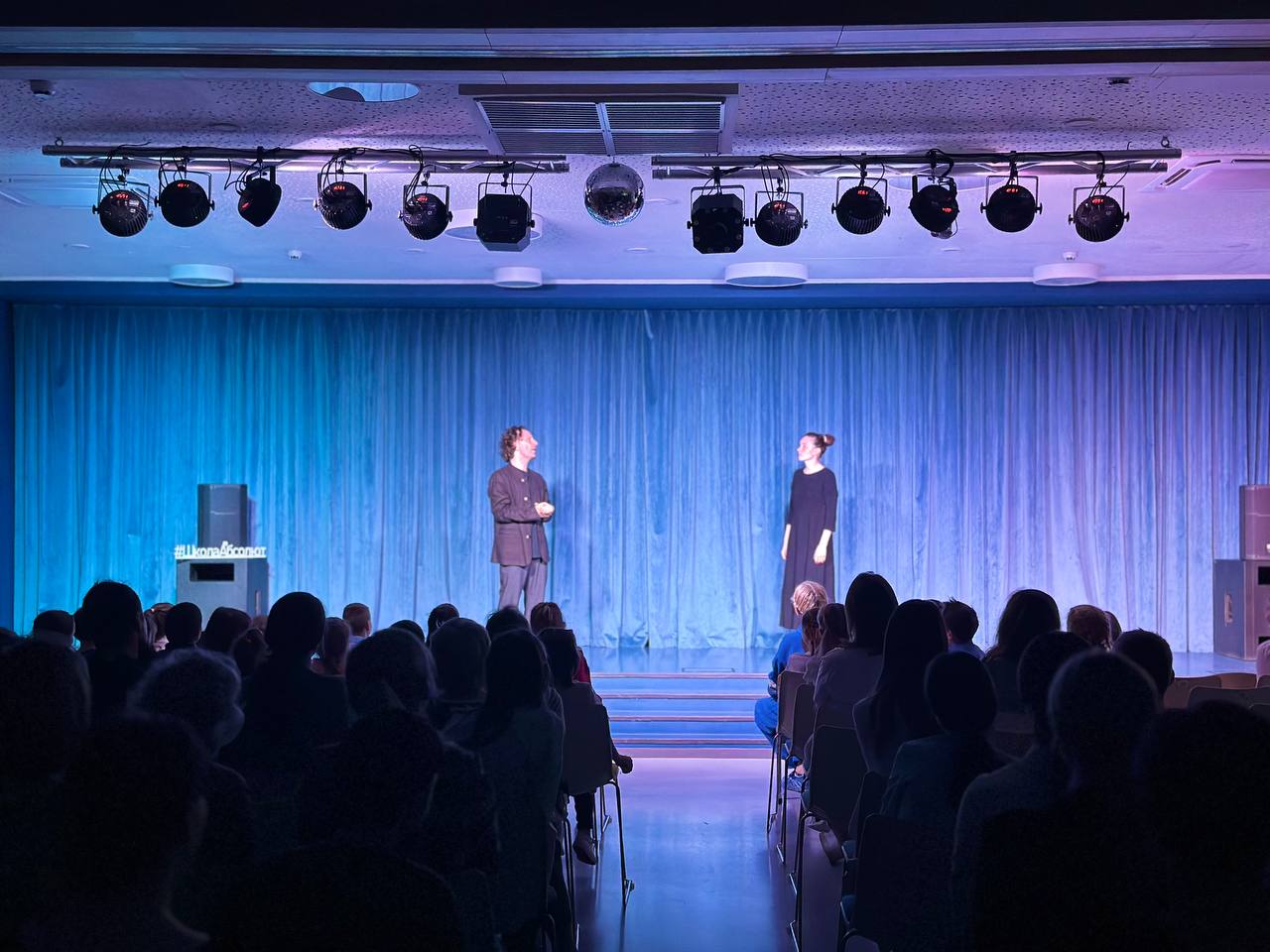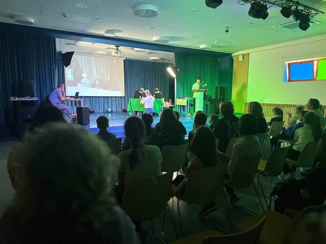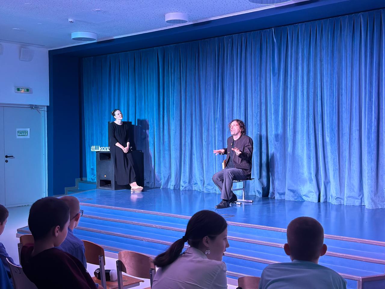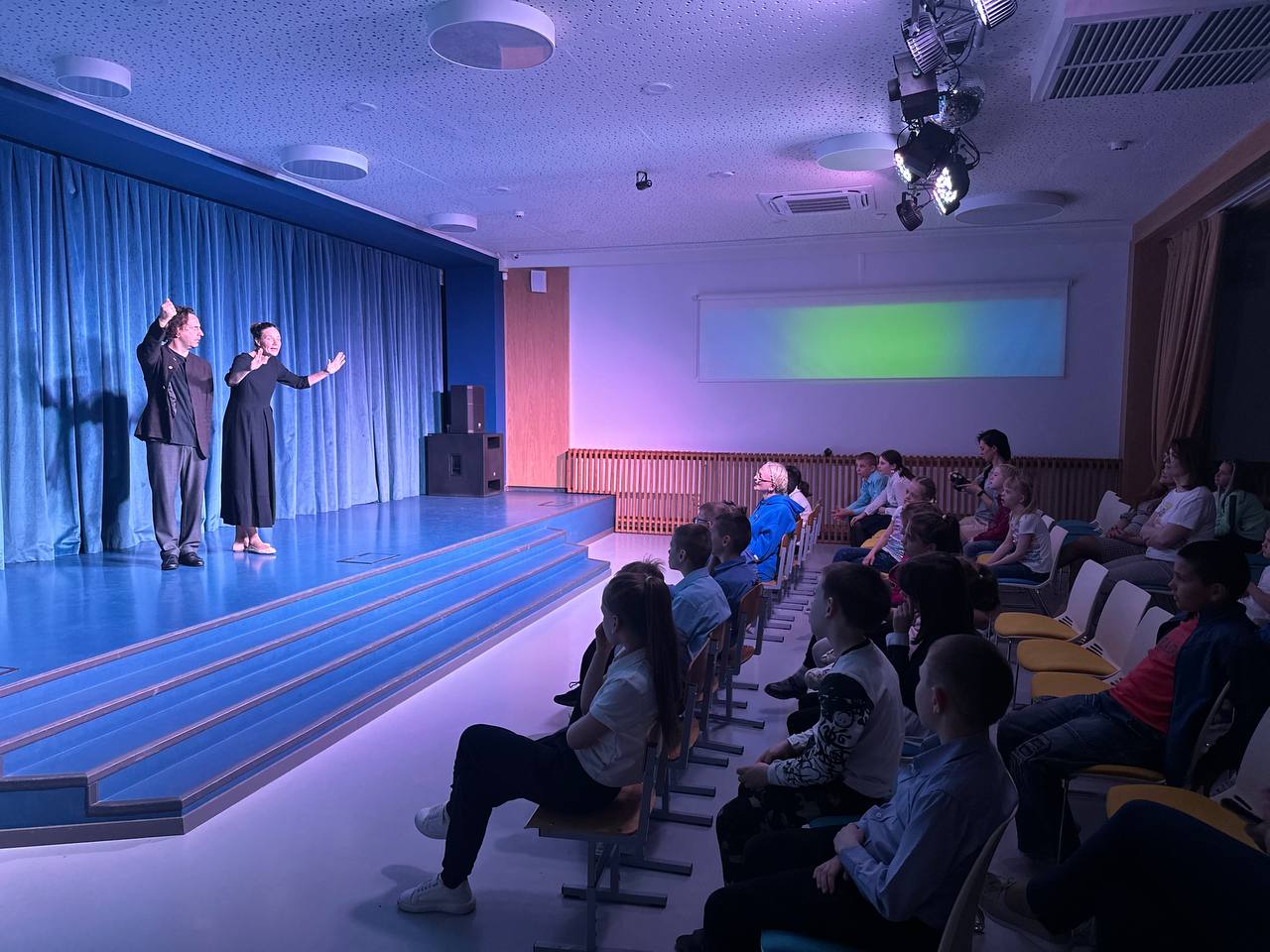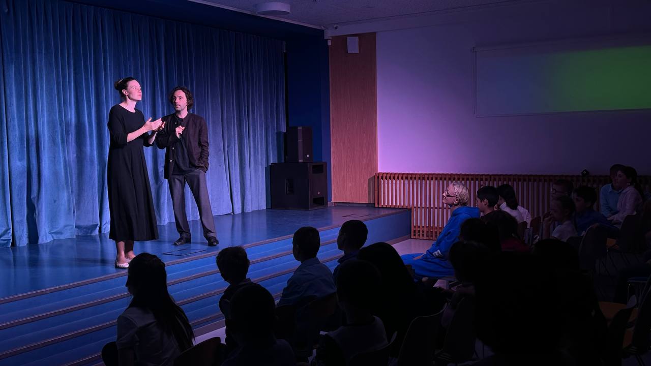 Каждый вечер школа превращается в центр притяжения, принимая родителей, педагогов и учащихся из других школ, а также друзей из Юны. Вечером школьная сцена преображается в настоящие театральные подмостки. Вчера мы посетили спектакль «Достоевский. Сторителлинг», где только двое актеров - Елена Горина и Александр Горелов - представили множество героев из жизни и творчества Федора Михайловича, используя только свои мимические, вокальные и телесные возможности. Они умело передавали эмоции, заставляя нас представлять, смеяться, горевать и сопереживать.