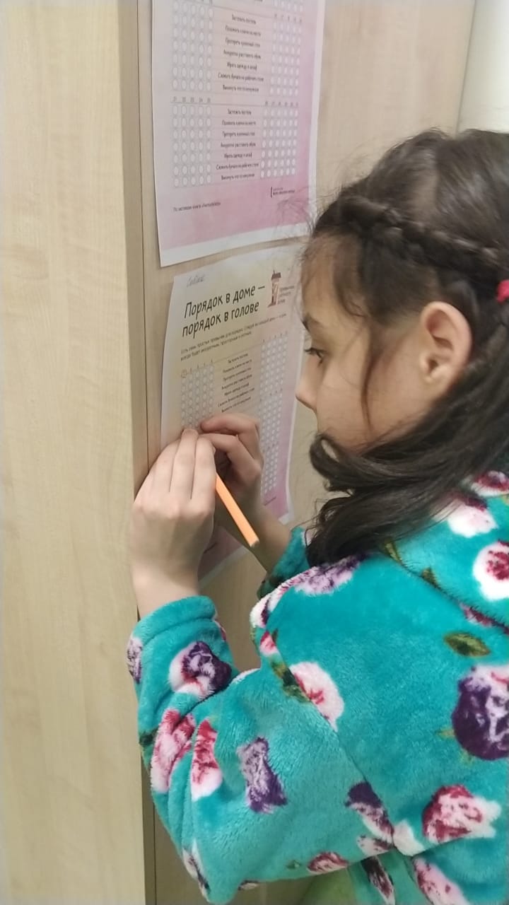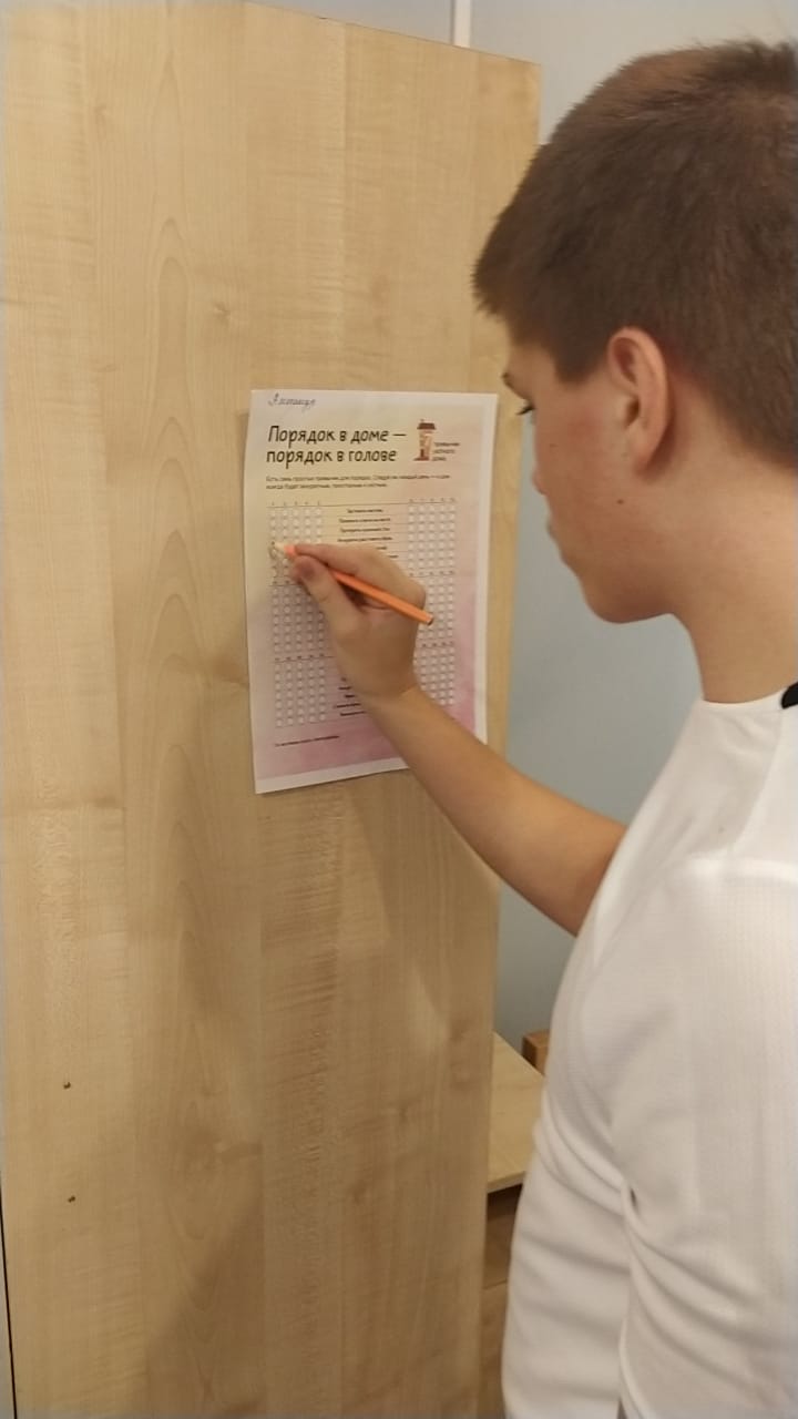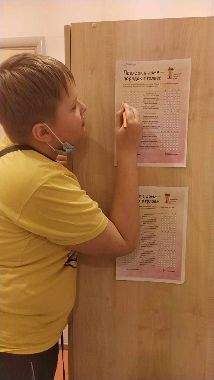 Еженедельно по четвергам на группе пятидневного (круглосуточного) пребывания подводятся итоги недели с параллельным закреплением социально-бытовых навыков. Обучающиеся самостоятельно накрывают и сервируют стол для чаепития, заправляют кровать и готовятся к урокам, а воспитатель помогает и курирует данный процесс. Наши обучающиеся начали подготовку к 23 февраля – изготовление открыток-закладок на подарок родным. Обсуждая заполнение Check-in «Порядок в доме – порядок в голове» обучающиеся отметили, что так легче запоминать, что необходимо делать ежедневно, например, заправить постель, убрать рабочее место, сложить одежду в шкаф, подготовить портфель и т.д. Также индивидуально разработанный чек-лист для ГПД и пятидневки заполняют воспитатели с целью фиксации и учета последовательных действий, которые необходимо выполнить, чтобы получить определенный результат в процессе воспитания и социализации обучающихся.